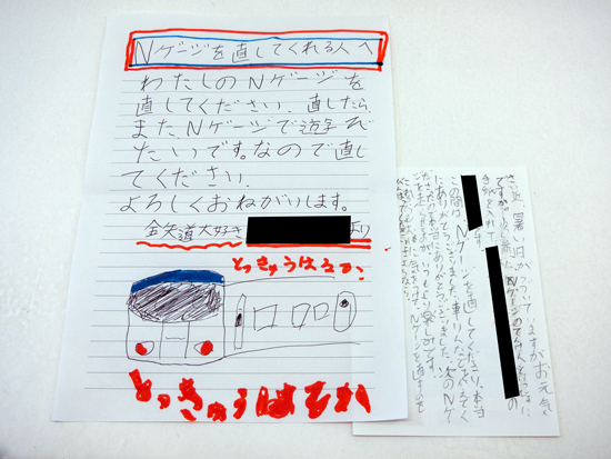 「Nゲージを直してくれる人へ」から始まるお手紙は、遊びたいのに遊べない残念な気持ちがひしひしと伝わりましたので、これは何とかしてあげないと!と痛みも忘れ気合が入ります(^^♪