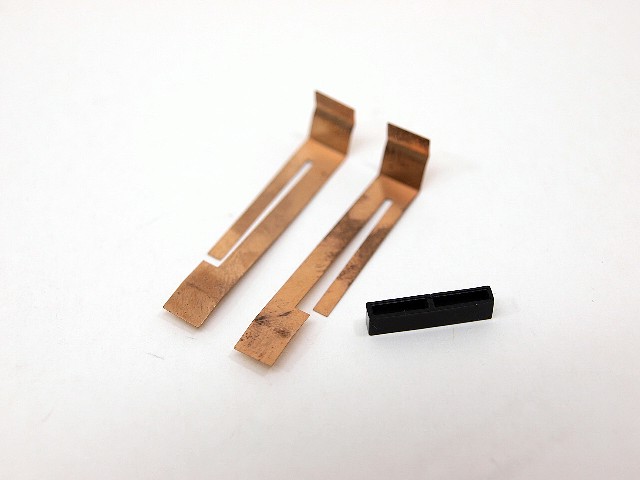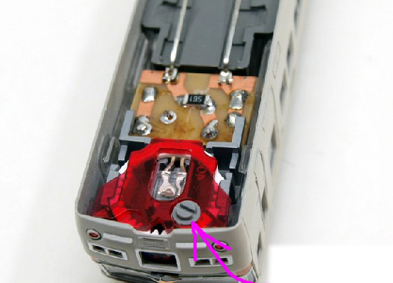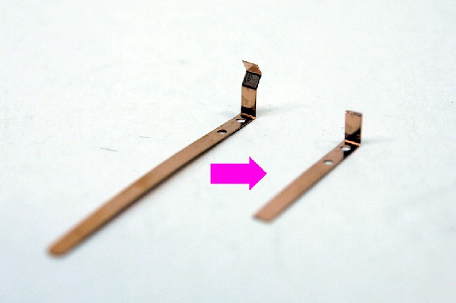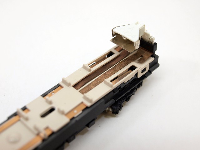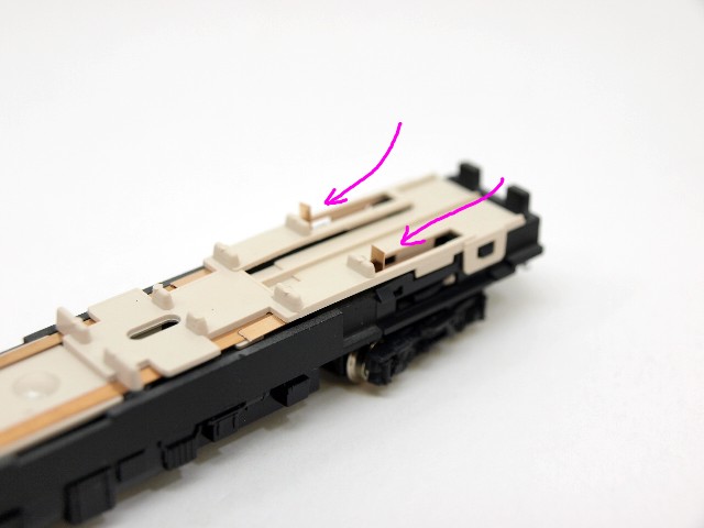 ・「集電シュー」を写真のように切断し、動力ユニットの通電部に滑り込ませます。
