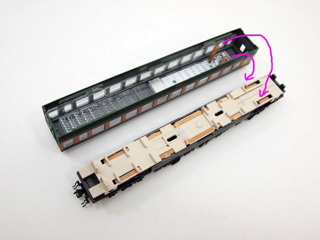 ・穴にスプリングを通してとりあえず点灯のチェックをします。そして室内灯レンズ部が屋根の中に入るようにしながら屋根をはめ込みます。