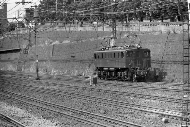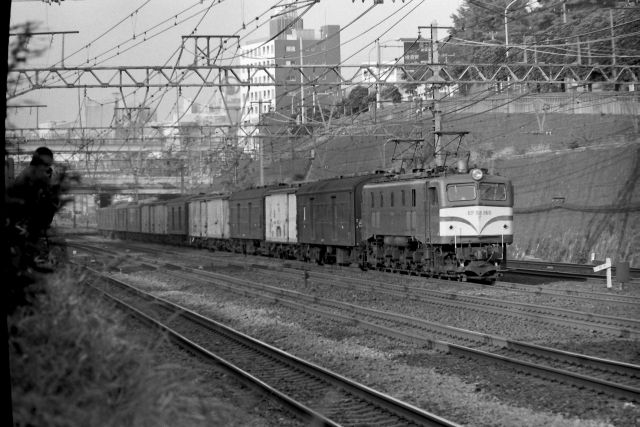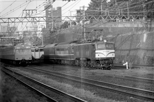 EF58の牽く上り「いなば(次のコマに後姿があったのでわかりました)」と、クモハ103低運転台の京浜東北線大宮行です。その間に113系スカ色がちょこっと見えますが、この頃まだ横須賀線は東海道線上を走行していました。