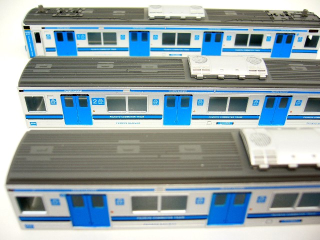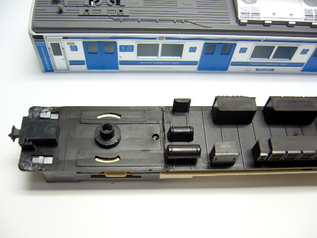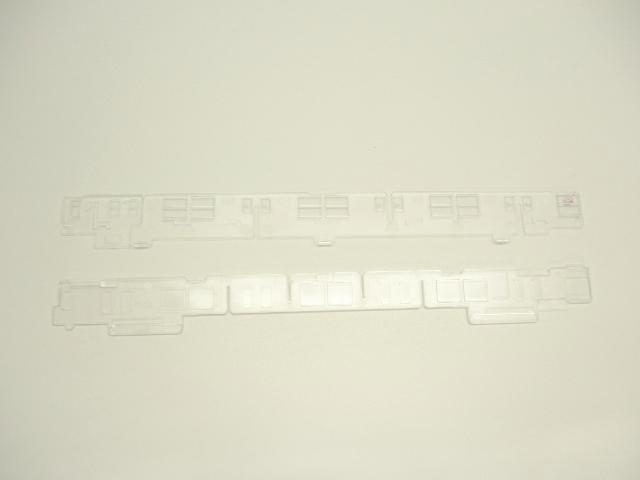 なんとサイズ的には「KATOの下回りを組み込んでください」と言わんばかりにピッタリですが、先頭の2両はヘッド&テールを点灯させる為、下回りを組み込むには側面ガラスパーツの切削が必要です。