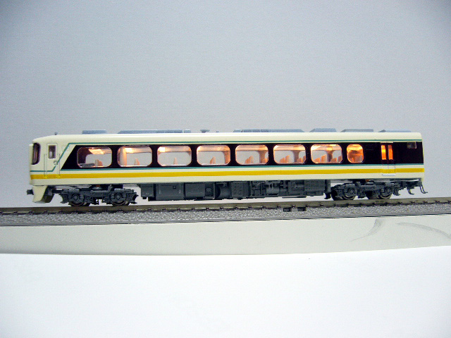 鉄コレのN化車輪を組み込もうと思いましたが、製品の床下や、台車間が短くちょっとカッコ悪かったので、いっそKATOのキハ85の下回りをぶち込んでやろうと無理やり乗っけてみました。