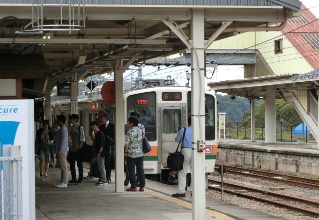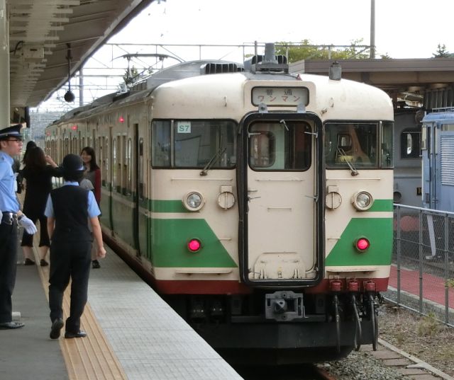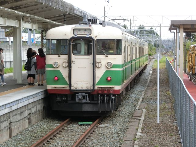 車内でのおやつ「おやき」を買い込み、「信州色(旧長野色)」をまとった115系に乗り込もうとすると、若い女性グループが入れ代わり立ち代わりでこの信州色と写真を撮っています。